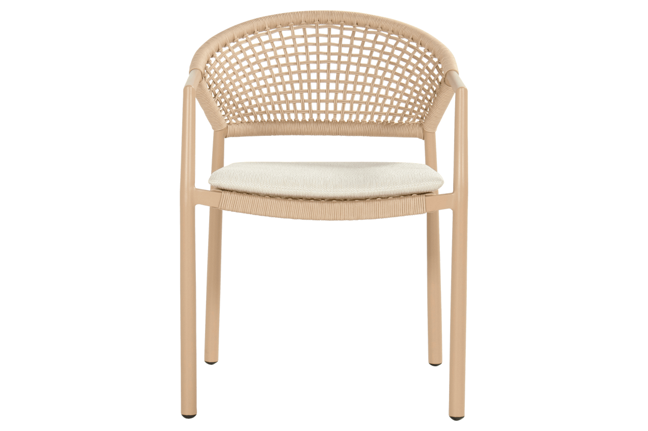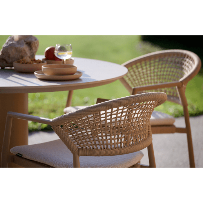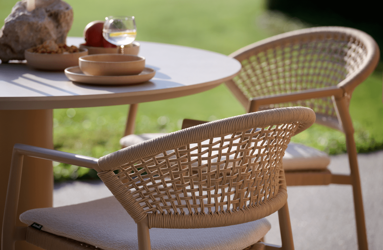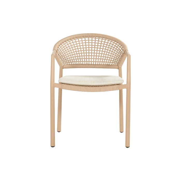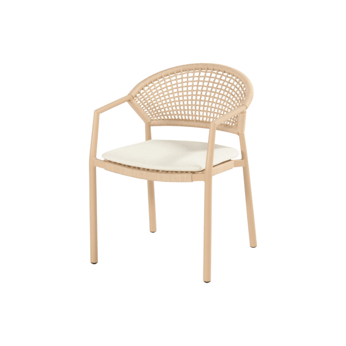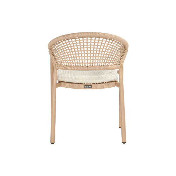 - Zahradní židle Taragona má unikátní povrchovou úpravu díky pletenému umělému lanu, které se tvoří mezi hliníkovým rámem. Kulatý hliníkový rám dodává židli pevnost a moderní nádech. Světle béžové polštáře vám poskytnou optimální pohodlí při sezení a dokonale se hodí k nejnovějším zahradním trendům, kde je béžová barevná paleta často k vidění.