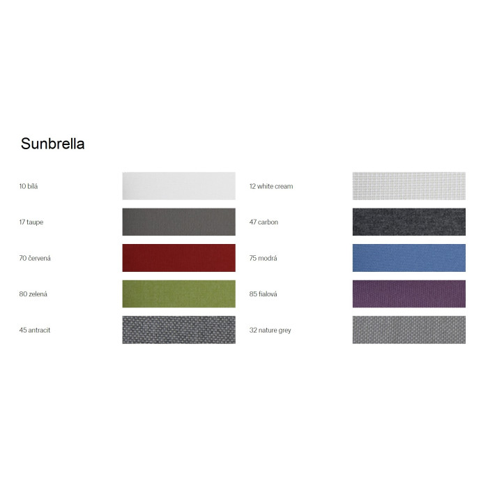 Sunbrella® stálobarevná a voděodolná látka, vyrobena technologií dodávající látce hebkost na omak. Materiál je 100% recyklovatelný, snadně se udržuje, je odolný vůči UV záření, chlórované a mořské vodě, plísni.