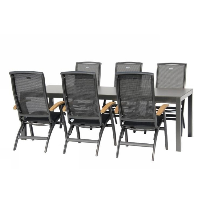 Deska HPL (High Pressure Laminate - vysokotlaký laminát). Kompaktní desky se skládají z pásů přírodních dřevěných vláken a syntetických pryskyřic. Vysoká odolnost proti povětrnostním vlivům a barevná stálost (UV odolnost). Stoly jsou vhodné ke všem židlím.