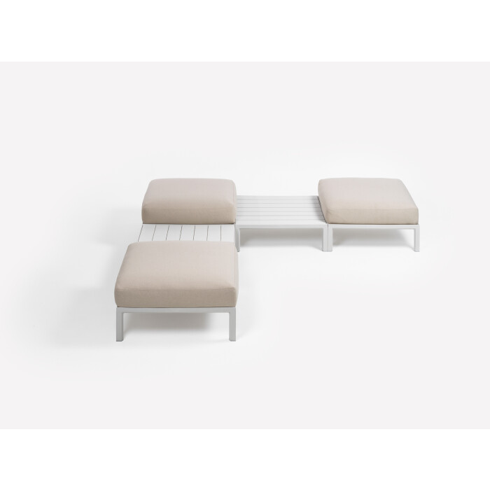 Zádová opěrka a rohový díl: polyuretanová pěna (hustota 17 kg/m3) potažená polyesterovým rounem spolu se 100% polyesterovou tkaninou s vodoodpudivou úpravou (WR) (hustota 200 gr/m2). - Lze doplnit i dalšími polštáři ve 3 různých velikostech.