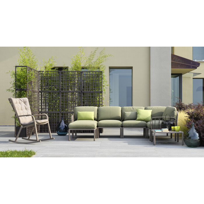 Poltrona Komodo centrální: je polstrované sedadlo se zádovou opěrkou, bez područek. Jedná se o samostatný modulární prvek, který tvoří počet míst k sezení. Lze vybrat libovolný počet, který potřebujete pro vytvoření vašeho posezení na míru. Jednotlivé díly pro sedací místa se spojují lehce tvarovanými spojkami - protidíly do sebe snadno zapadnou a při demontáži se opět lehce vyjmou. Stavebnicový systém umožňuje z jednotlivých elementů vytvořit modulární pohovku do jakéhokoliv tvaru.