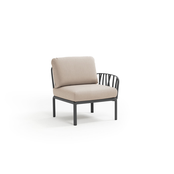 Poltrona Komodo krajní: je postrované sedadlo se zádovou opěrkou, s loketní područkou na jedné straně. Loketní područka je univerzální, lze jí namontovat z obou stran, tj. zleva nebo zprava. Jedná se o modulární prvek, kterým se ukončuje sedačka. Připojí se zleva nebo zprava na okraj sedačky. Lze vybrat libovolný počet, který potřebujete pro vytvoření vašeho posezení na míru a to zakončíte právě tímto krajním prvkem, který obsahuje loketní opěrku. Jednotlivé díly pro sedací místa se spojují lehce tvarovanými spojkami - protidíly do sebe snadno zapadnou a při demontáži se opět lehce vyjmou. Stavebnicový systém umožňuje z jednotlivých elementů vytvořit modulární pohovku do jakéhokoliv tvaru. Doporučujeme využívat v zastíněných prostorách.