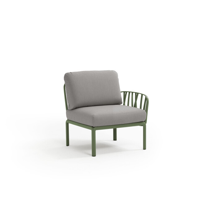 Poltrona Komodo krajní: je postrované sedadlo se zádovou opěrkou, s loketní područkou na jedné straně. Loketní područka je univerzální, lze jí namontovat z obou stran, tj. zleva nebo zprava. Jedná se o modulární prvek, kterým se ukončuje sedačka. Připojí se zleva nebo zprava na okraj sedačky. Lze vybrat libovolný počet, který potřebujete pro vytvoření vašeho posezení na míru a to zakončíte právě tímto krajním prvkem, který obsahuje loketní opěrku. Jednotlivé díly pro sedací místa se spojují lehce tvarovanými spojkami - protidíly do sebe snadno zapadnou a při demontáži se opět lehce vyjmou. Stavebnicový systém umožňuje z jednotlivých elementů vytvořit modulární pohovku do jakéhokoliv tvaru. Doporučujeme využívat v zastíněných prostorách.