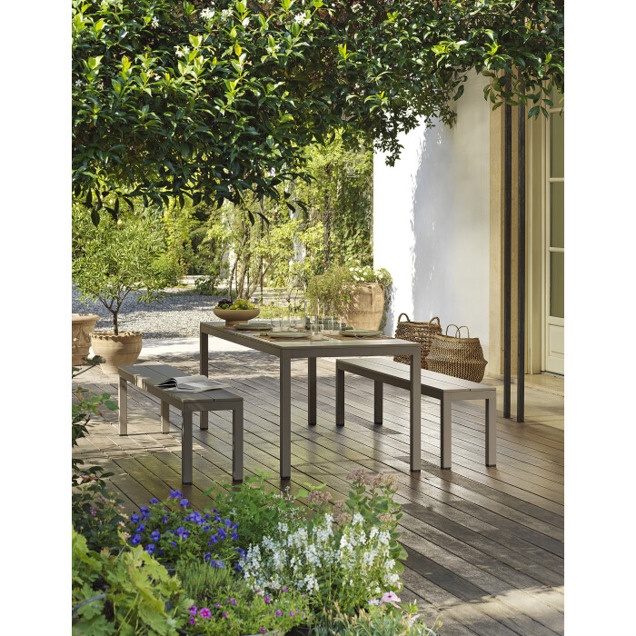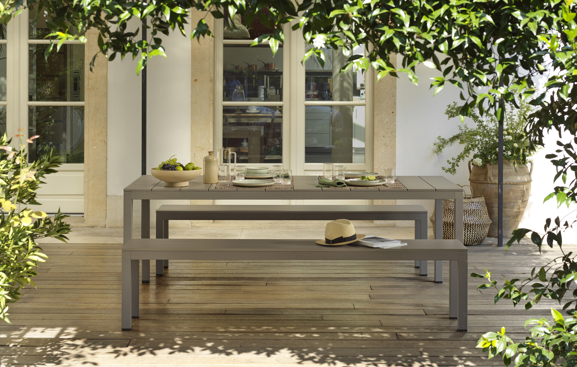 Rio Alu Fix je stůl s lamelovou lakovanou hliníkovou deskou s pruhovanou texturou a lakovaným hliníkovým rámem. Výrazná osobnost s přísnými architektonickými tóny a texturovaným vzhledem.
