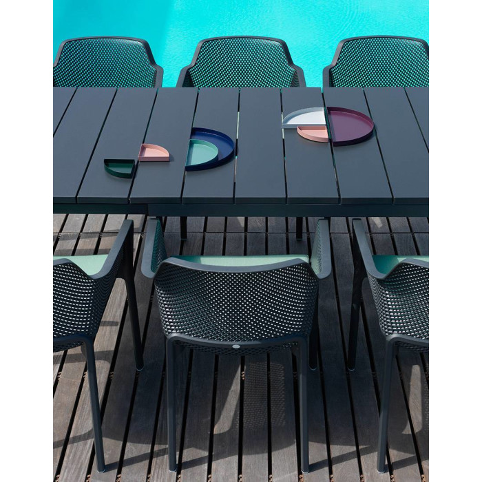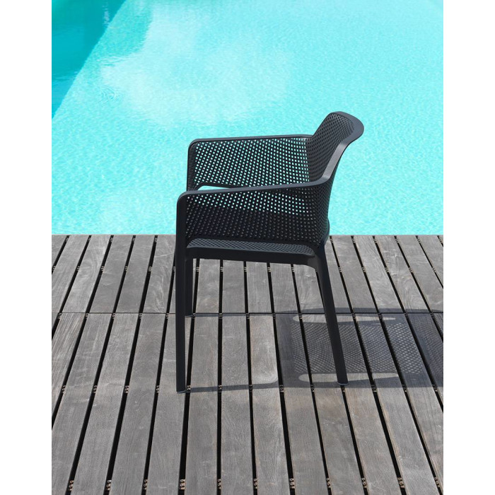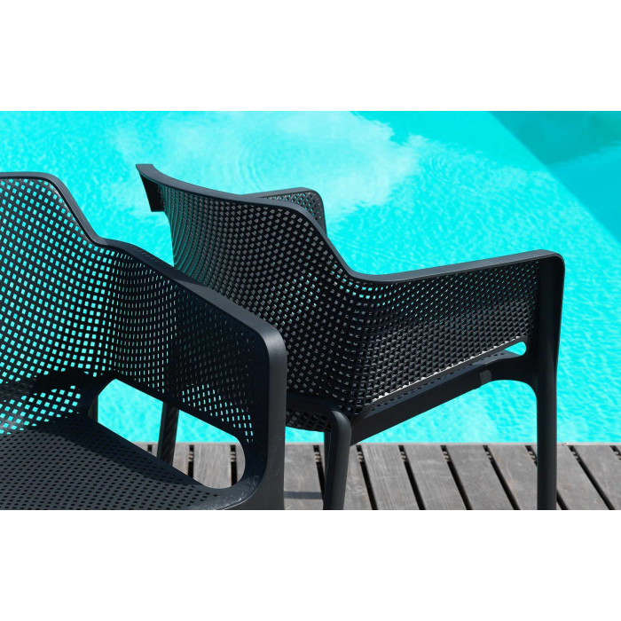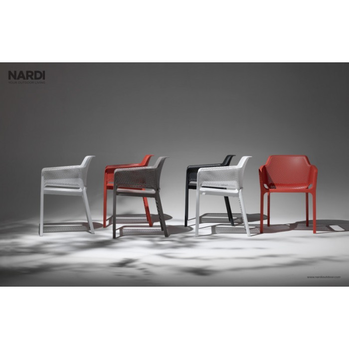 Křeslo Net, pohodlná židle s područkami k jídelnímu stolu. Vyrobena z nejkvalitnějšího konstrukčního polypropylenu zpevněného skelným vláknem. Materiál obsahuje aditiva proti působení UV záření a tak je chráněn proti atmosférickým vlivům. Probarvení ve hmotě zajišžuje stálost barevného provedení. Křeslo je určeno pro využití ve vysoce náročných restauračních a hotelových provozech. Ke křeslu bude možné objednat i polstry.