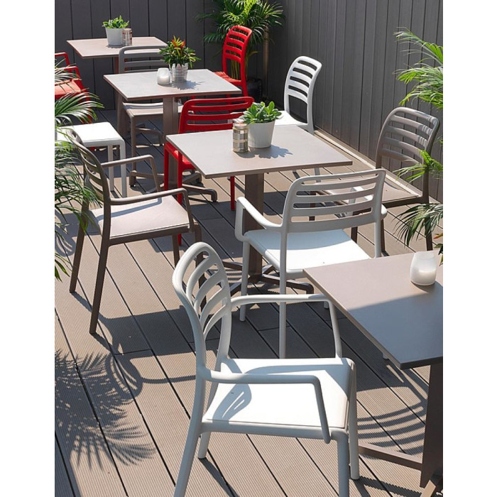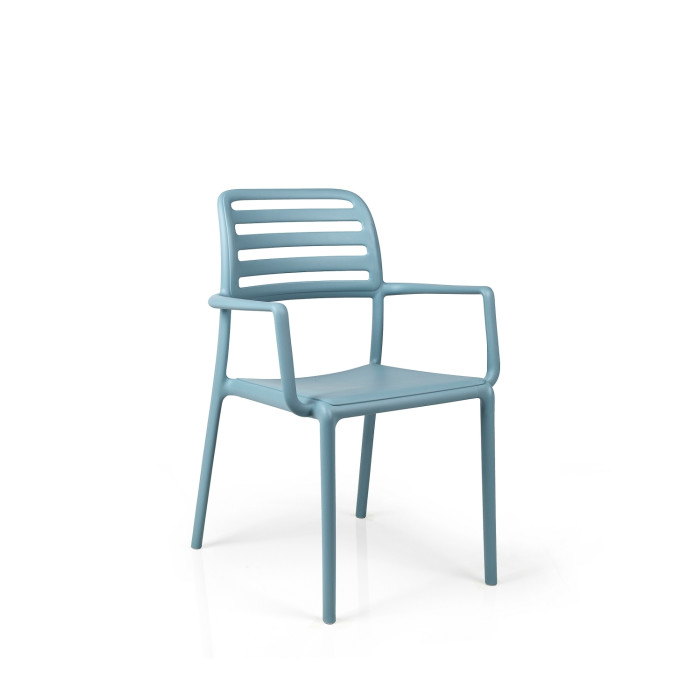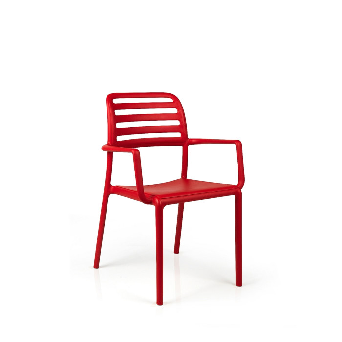 Costa, pohodlná židle s područkami k jídelnímu stolu. Vyrobena z nejkvalitnějšího konstrukčního polypropylenu zpevněného skelným vláknem. Materiál obsahuje aditiva proti působení UV záření a tak je chráněn proti atmosférickým vlivům. Probarvení ve hmotě zajišžuje stálost barevného provedení. Křeslo je určeno pro využití ve vysoce náročných restauračních a hotelových provozech. Ke křeslu bude možné objednat i polstry.
