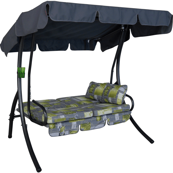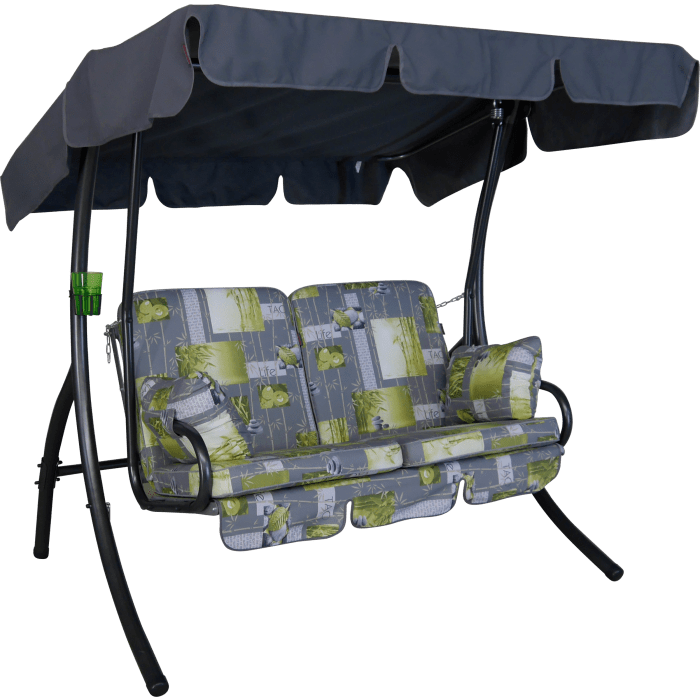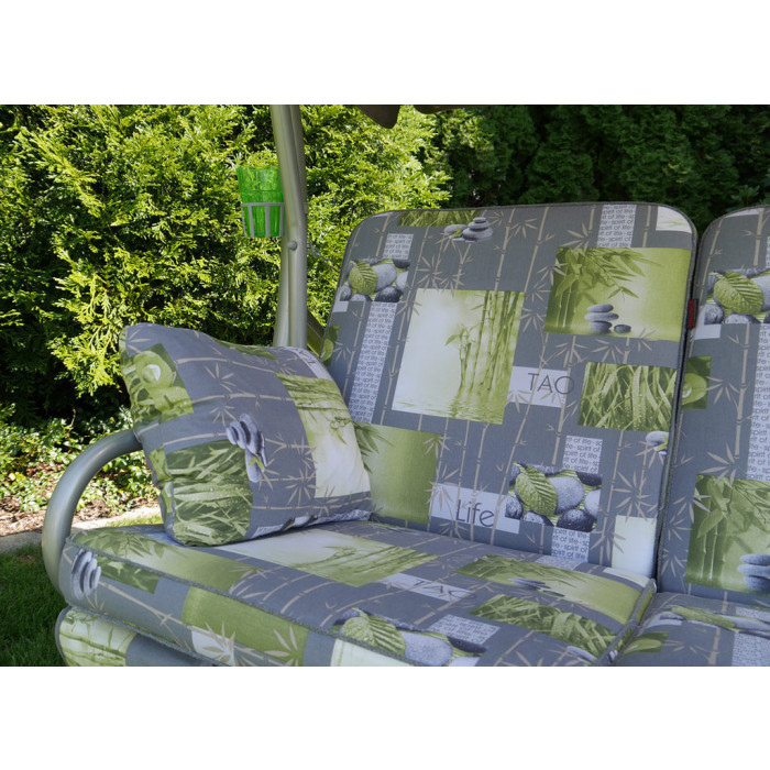 Dvoumístná houpačka s dekorem Bambus polstrů a šedé střechy. Vzhledem k menší velikosti houpačky je vhodná k umístnění na balkon, předzahrádku či terasu.