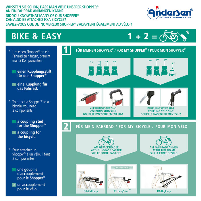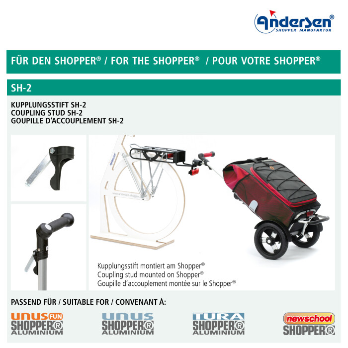 Spojka přípojného mechanismu, která slouží k uchycení tašky ke kolu. Přípojný mechanismus se skládá ze dvou spojek. Jedna spojka (SH-1 nebo SH2) je připevněna na kostře nákupní tašky a druhá spojka (R1, G1, A1), která je upevněna na zadní části kostry kola.