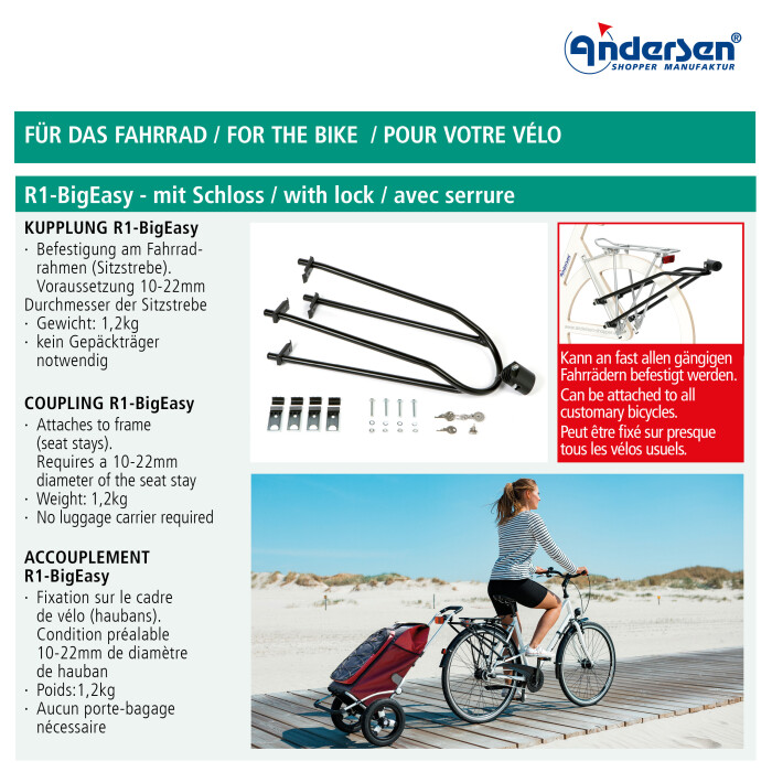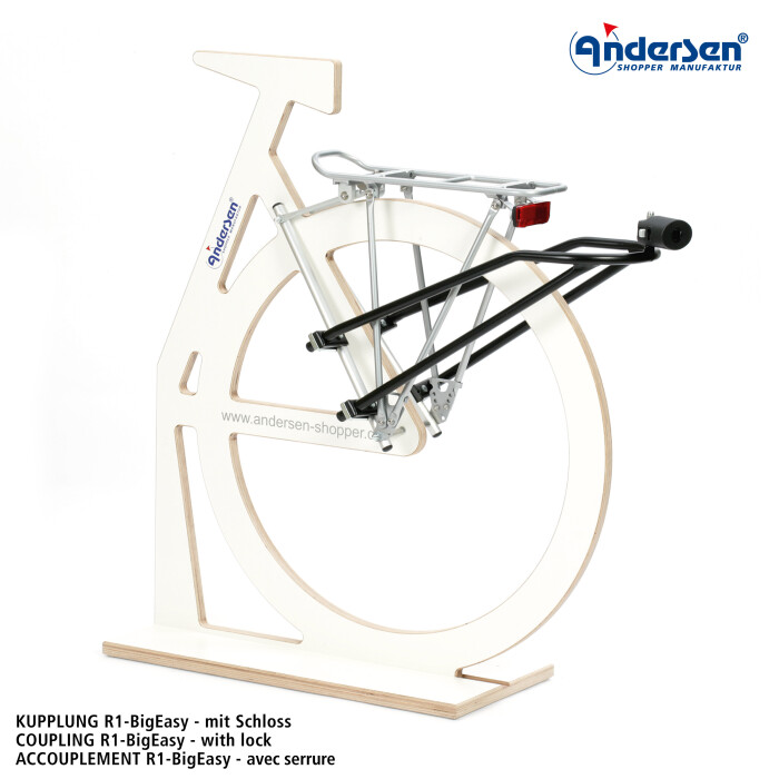 Spojka R1-BigEasy se zámkem je určena na připevnění k zadní části rámu kola a pomocí spojky SH-1 nebo SH-2 se zapojí nákupní taška ke kolu.