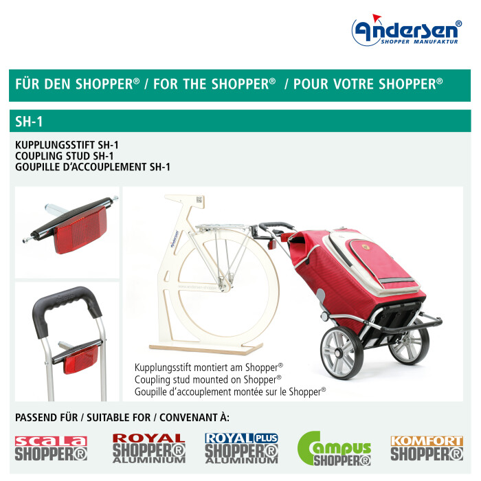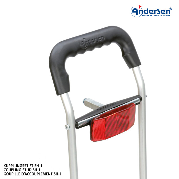 Spojka přípojného mechanismu, která slouží k uchycení tašky ke kolu.Přípojný mechanismus se skládá ze dvou spojek. Jedna spojka (SH-1 nebo SH2) je připevněna na kostře nákupní tašky a druhá spojka (R1, G1, A1), která je upevněna na zadní části kostry kola.