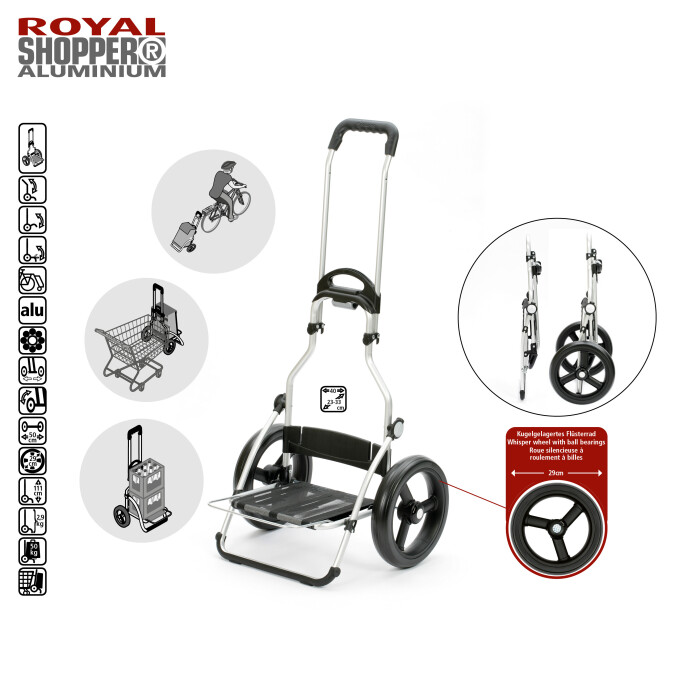 ROYAL SHOPPER, luxusní řada tašek z hliníku s možností výběru kol různých velikostí. Koly plnými, nafukovacími nebo i s ložisky. Tuto nepřehlédnutelnou řadu skládacích tašek na kolečkách lze využít k různým cestám. Snadno pojedou po nezpevněných chodnících nebo parkovištích před hotely, dokonce zvládnou i schody.
