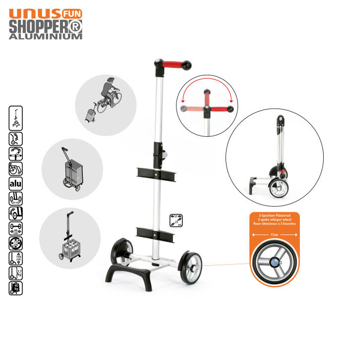 Multifunkční taška na kolečkách UNUS SHOPPER FUN, tato řada tašek je vhodná pro různé využití. Můžete s ní chodit do práce, do obchodu, jezdit na dovolenou a podobně. Pomocí přípojného mechanizmu jí můžete připojit i za jízdní kolo. Je vyrobena z hliníku v moderním stylu.