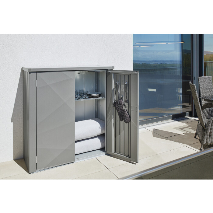 Krásná skříň s vysokou užitnou hodnotou. Je velmi praktická pro malé prostory. V zahradě, na terase, v garáži nebo na balkóně, chrání a udržuje pořádek, aniž by omezovala Váš životní prostor. Se skříní na nářadí od Biohortu můžete uklidit své zahradní náčiní, nářadí, hračky apod. a ochránit je před dešťovou vodou nebo krádeží. Harmonicky se začlení – vzhledem ke své kompaktní velikosti a elegantnímu designu - na každém místě.