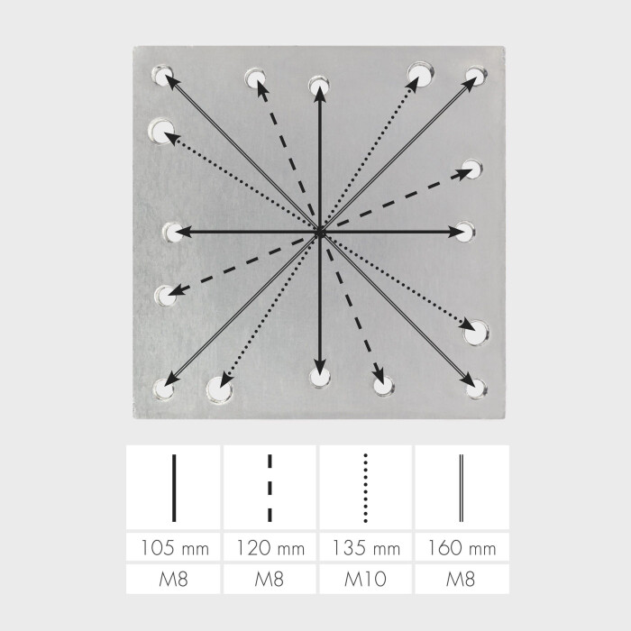 Tato pevná zemní kotva z pozinkované oceli se používá pro upevnění pro výkyvné slunečníky. Kromě toho je zemní kotva kompatibilní s hliníkovým stožárem pro Clonu AluPro. Je vhodná pro upevnění slunečníků se základnou s děrováním 105 mm, 120 mm, 135 mm a 160 mm.
