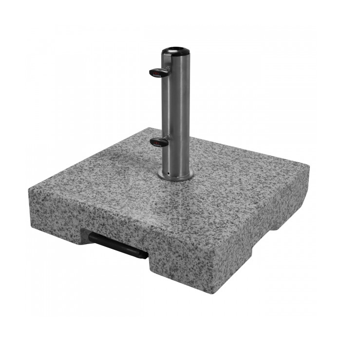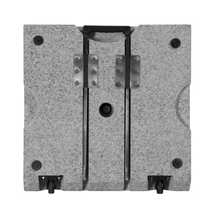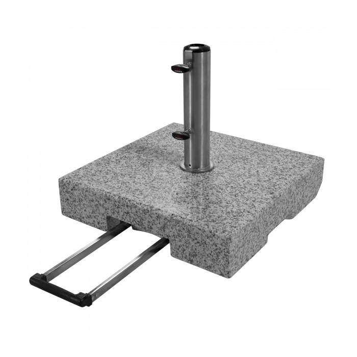 Žulový sokl TROLLEY 50 kg Vyroben ze světle šedé žuly s 2 koly a rozšiřitelnou trolejovou rukojetí. Vhodný pro snadnou přepravu. Nerezová tyč má několik redukčních kroužků a umožňuje použití průměrů deštníku do max. 60 mm (od 32-60mm). Slunečník se kotví do tyče (trubka z nerezové oceli) pomocí dvou pojistných šroubů.
