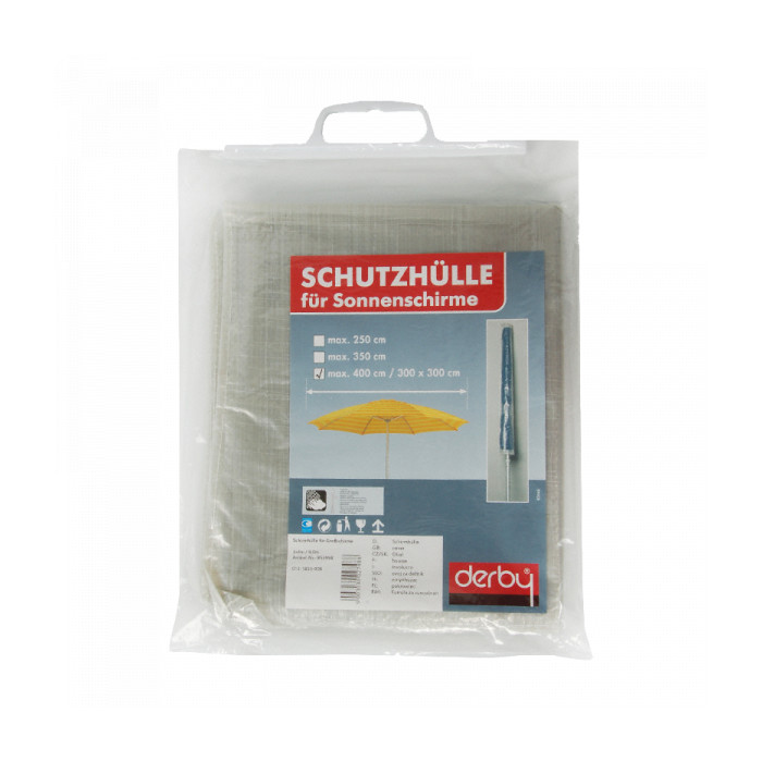 Slunečníkový obal Basic až do 400 cm a 300x300 cm. UV-stabilizovaná tkanina v bílé barvě s tkaničkami, 120 g/m2. Materiál / barva: 100% polyethylen / bílá. Pro velké slunečníky o velikosti max. 400 cm a 300x300 cm. Provedení bez zipu a bez tyčky. Praktické balení v tašce. Ochranný obal NENÍ VHODNÝ pro výkyvné slunečníky.