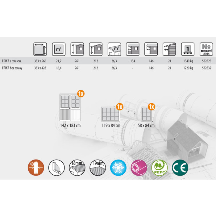 - Okno: 1ks 119 x 84 cm a 1 ks 58 x 84 cm