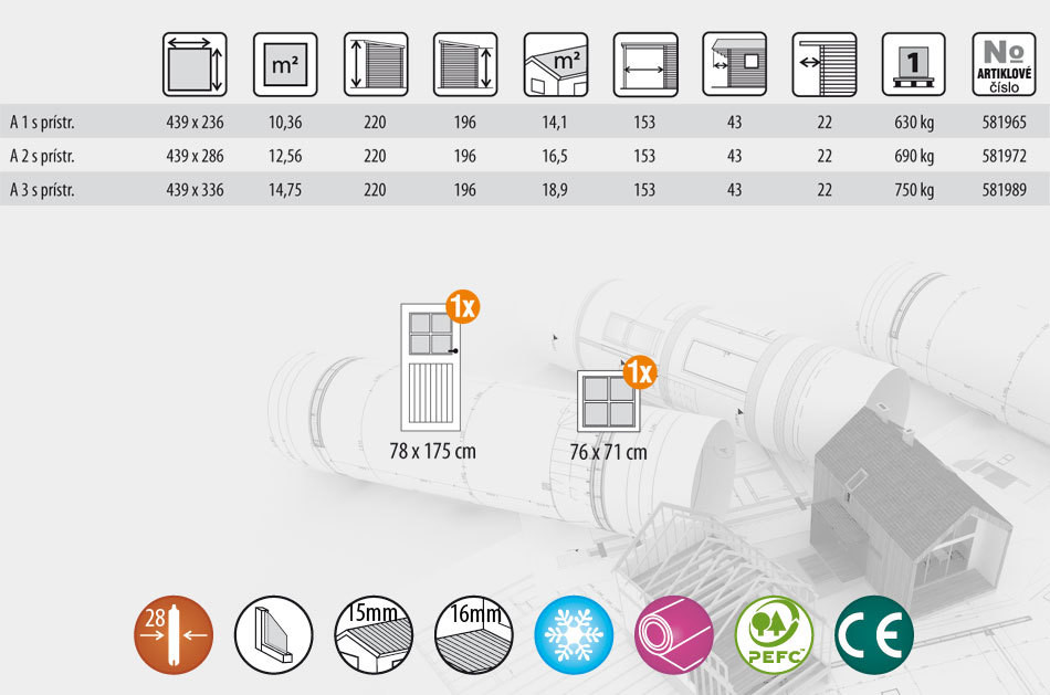 - Plocha střechy chatky: 14,1 m2