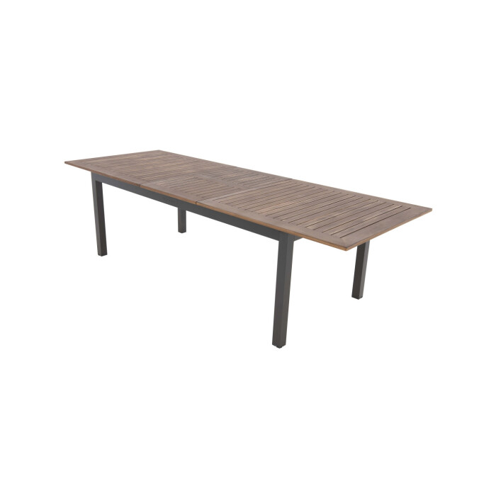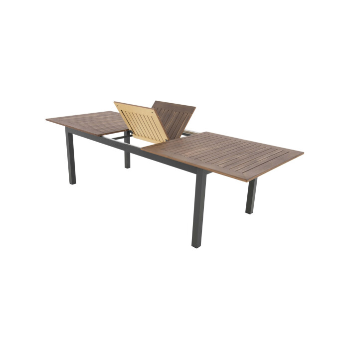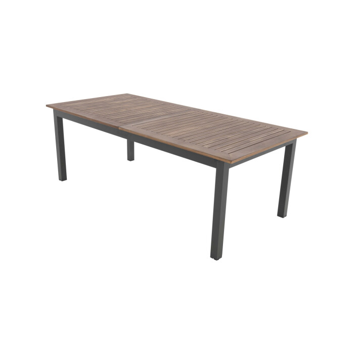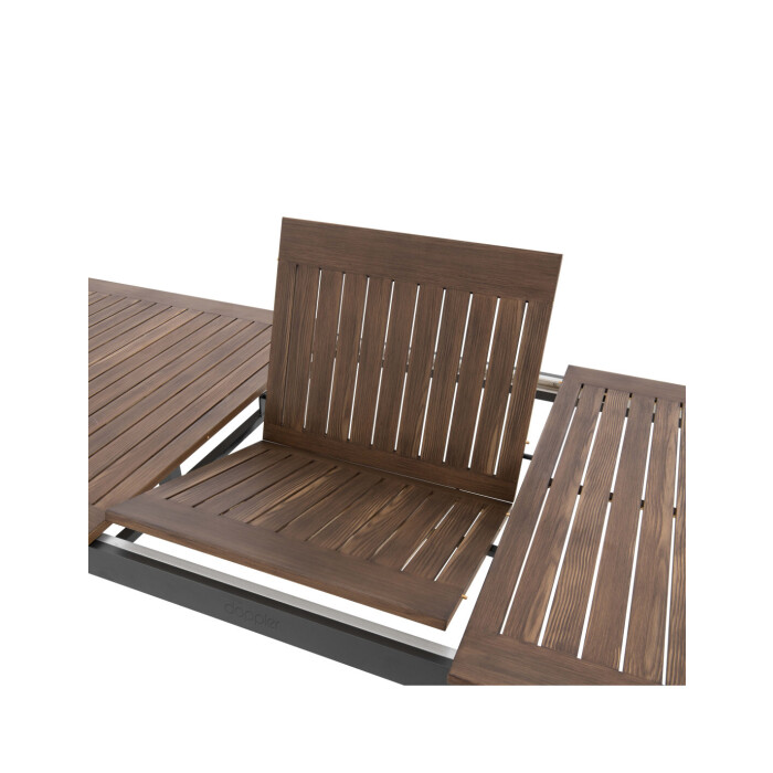 Rozkládací stůl EXPERT WOOD má odolnou hliníkovou konstrukci v antracitové barvě. Žebrovaná hliníková deska stolu má práškový nástřik v tónu tmavého dřeva. Díky tomu je stůl lehký, bezúdržbový a odolný povětrnostním vlivům. Tím se stává zahradním nábytkem s dlouhou životností.
