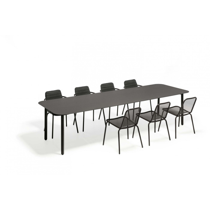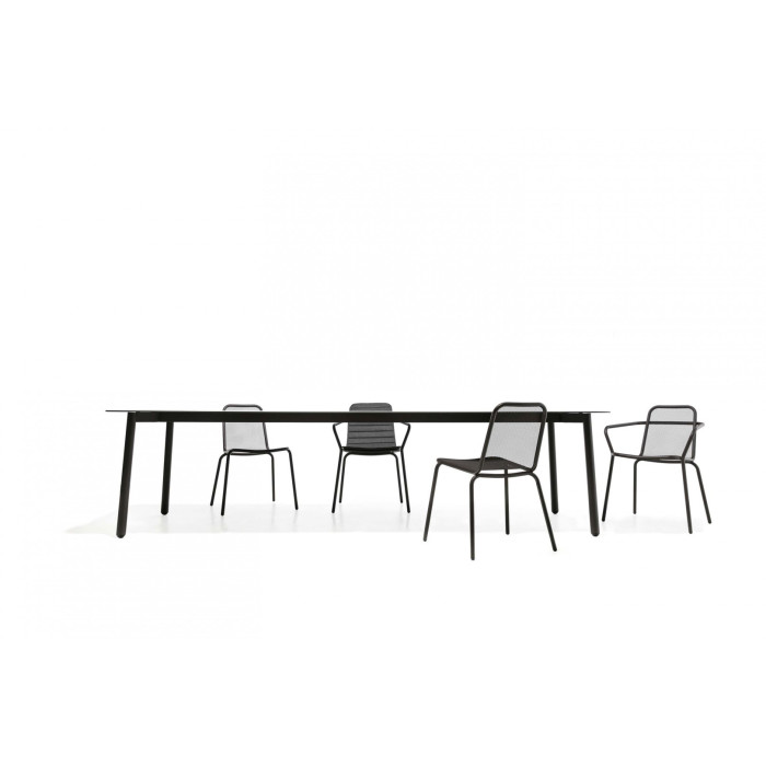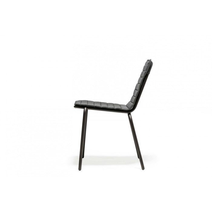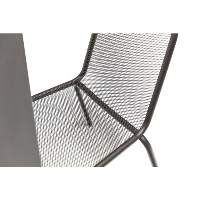 Židle a křesla jsou tvořeny precizně vedenými liniemi z ohýbané práškově lakované oceli, které nejsou ničím přerušeny. Všechny svary, podobně jako plynulé napojení síťoviny na rám, jsou důmyslně ukryté tak, aby byly nepostřehnutelné. Práškově lakovaná ocel osvobozuje kovový nábytek od tíhy a dodává mu odolnost i do přímořského prostředí. Židle a křesla doplňuje příčně žebrované polstrování nasouvané na opěradlo.