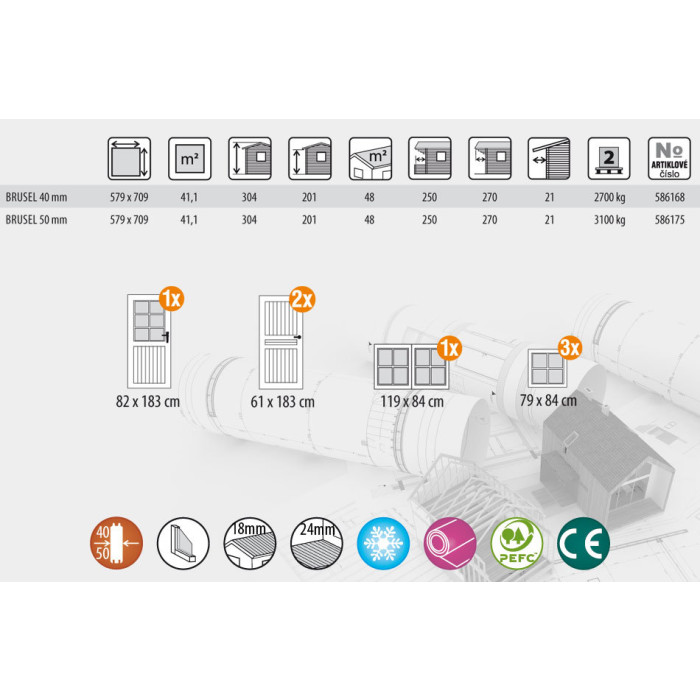 • Dveře: 1 ks prosklené 82 x 183 cm, 2 ks plné dveře 61 x 183 cm