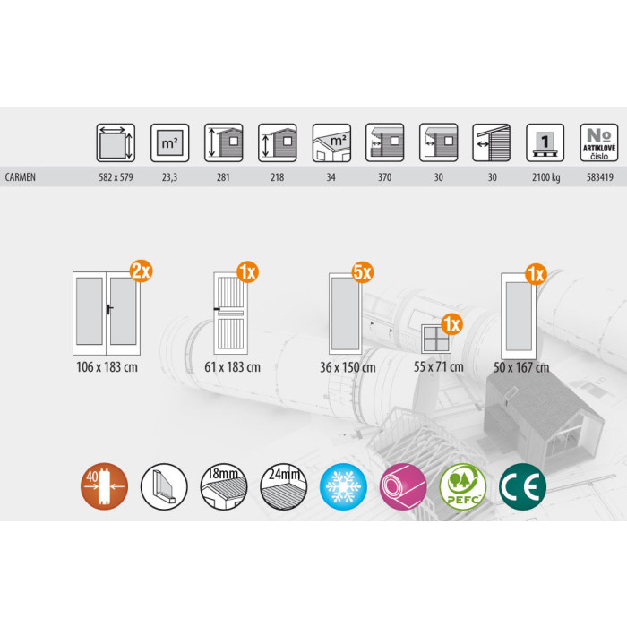 • Okno: 5 ks 36 x 150 cm, 1 ks 55 x 71 cm, 1 ks 50 x 167 cm
