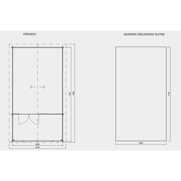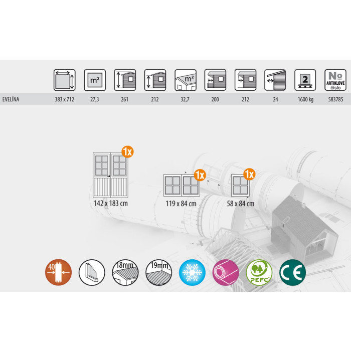 - Dveře (2-křídlé, prosklené): 142 x 183 cm